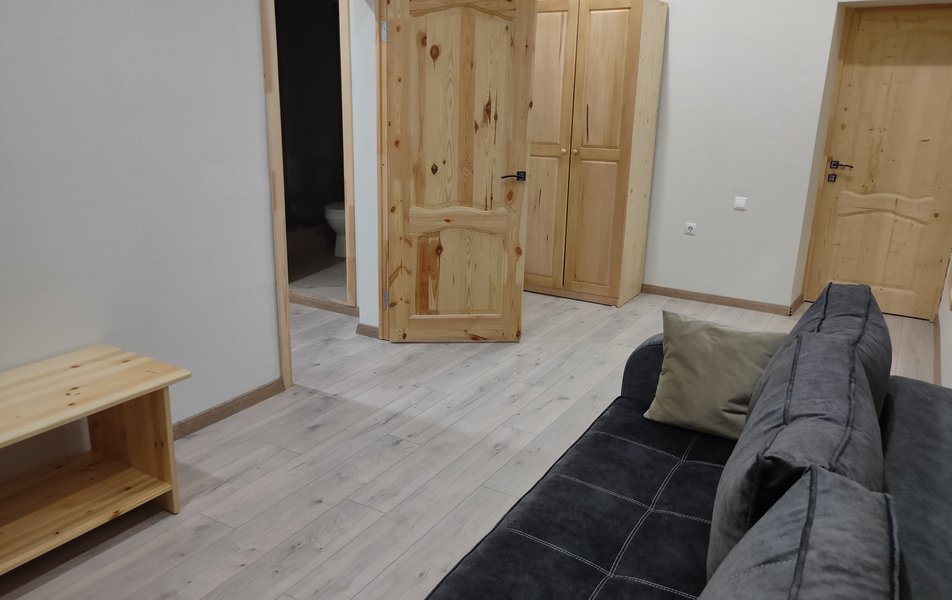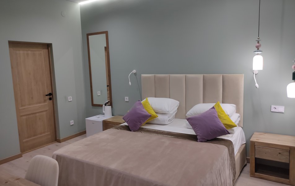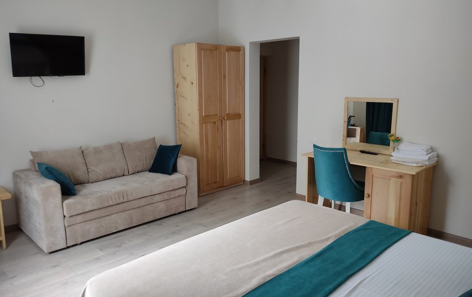 В номере: вешалка, зеркало, диван, кровати односпальные /одна двуспальная кровать, прикроватные тумбочки, стол, стул, шкаф, мини-холодильник, набор посуды, телевизор, электрочайник