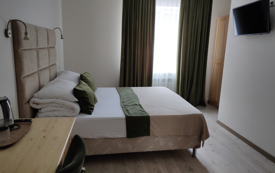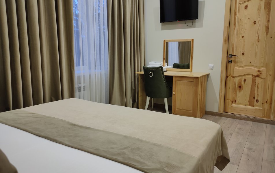 В номере: вешалка, зеркало, кровати односпальные /одна двуспальная кровать, прикроватные тумбочки, стол, стул, шкаф, мини-холодильник, набор посуды, телевизор, электрочайник